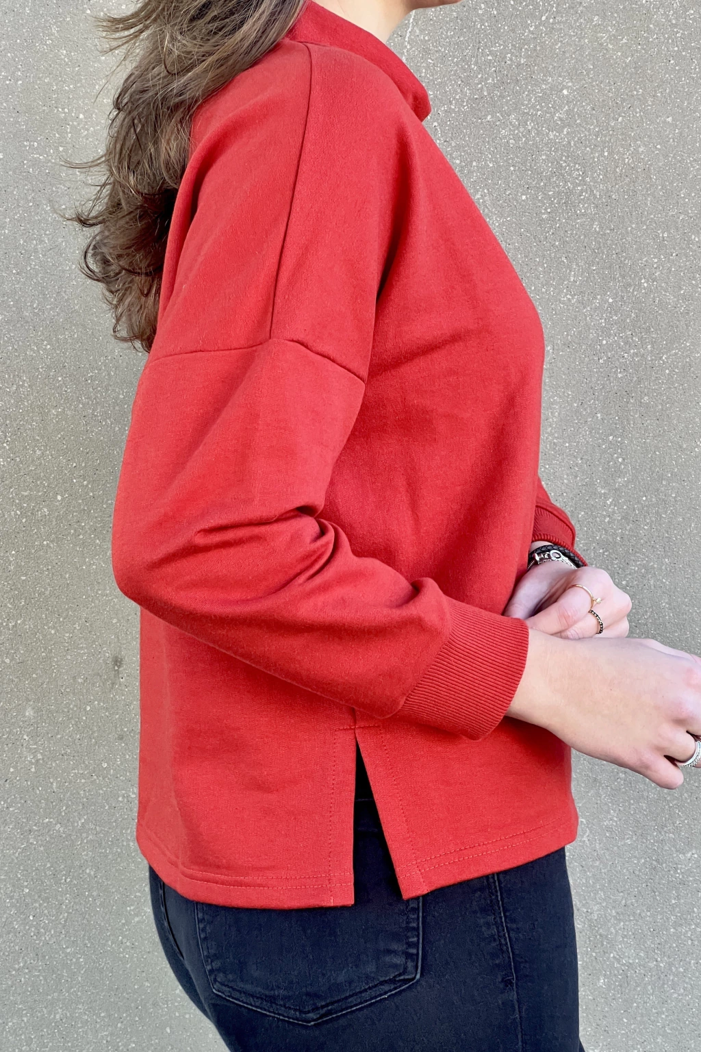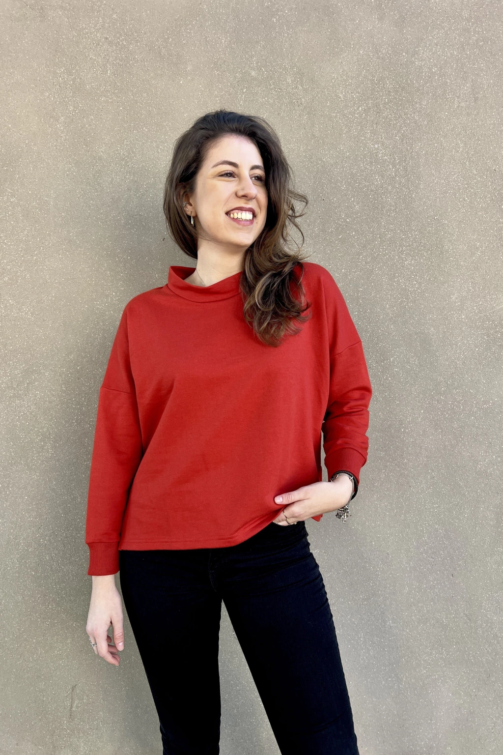 Uma blusa coringa para inverno e meia estação. Com manga 7/8, gola ampla e com acabamento largo, modelagem mais oversized e com um comprimento ideal para utilizar com outras peças.